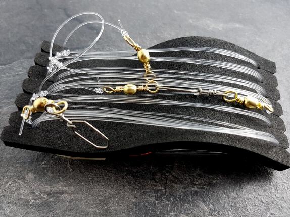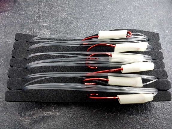 Ein Rotbarschsystem der Extraklasse, 6 Haken, 4 Wirbeln an einer 0,80er Schnur mit roten Haken und sehr hellen Leuchtschlauch.